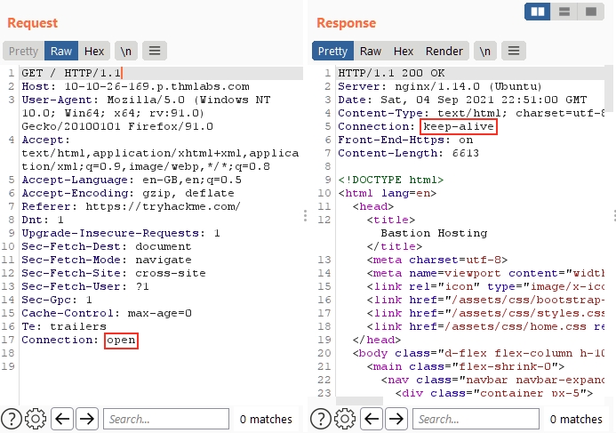 Should we wish to modify any aspect of the request, we can simply type within the Request view and press Send once again. This action will update the Response view on the right accordingly. For instance, altering the Connection header to "open" instead of "close" yields a response with a Connection header containing the value "keep-alive":