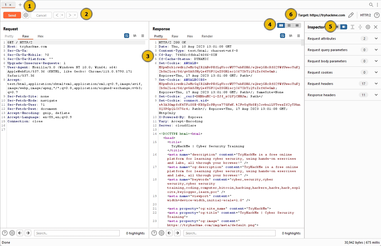 Inspector: Positioned on the right-hand side, the Inspector allows us to analyze and modify requests in a more intuitive manner than using the raw editor. We will explore this feature in a later task.