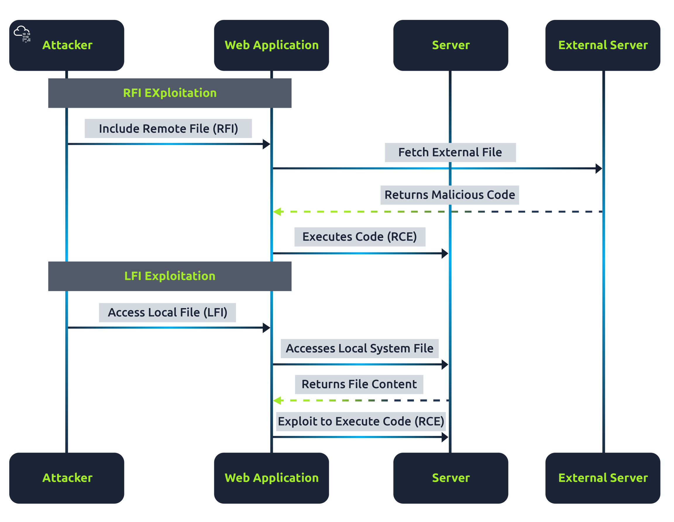 This diagram above differentiates the process of exploiting RFI and LFI vulnerabilities. In RFI, the focus is on including and executing a remote file, whereas, in LFI, the attacker aims to access local files and potentially leverage this access to execute code on the server.