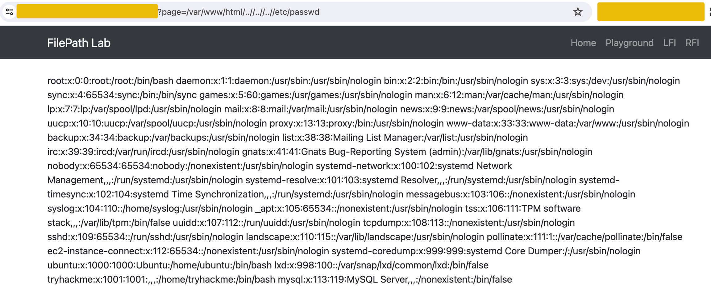 For example, go to http://10.10.198.29/lfi.php and use the payload /var/www/html/..//..//..//etc/passwd.