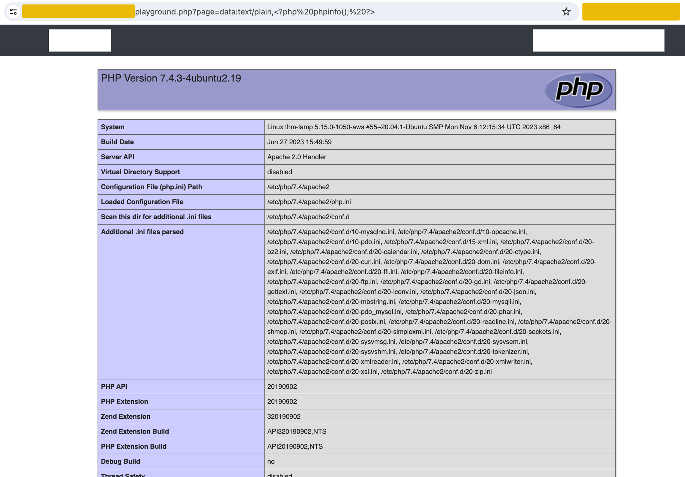 For example, go to http://10.10.198.29/playground.php and use the payload data:text/plain,<?php%20phpinfo();%20?>. In the below image, this URL could cause PHP code execution, displaying the PHP configuration details.