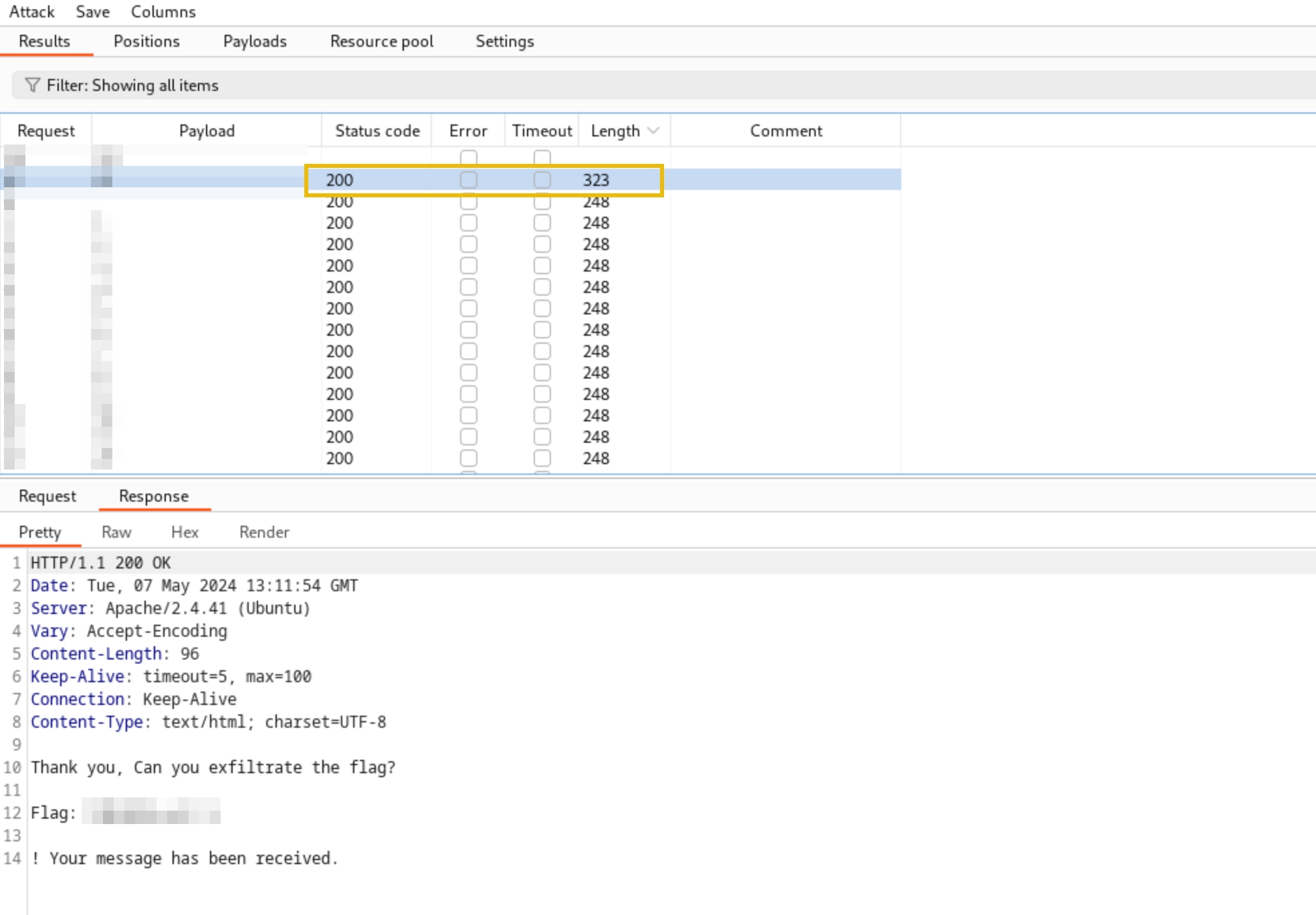 3. Once done, click the Start attack button and click the Length column to sort which item has the largest size. The difference in the server's response size is worth further investigation since it might contain information that is different compared to the other intruder requests.